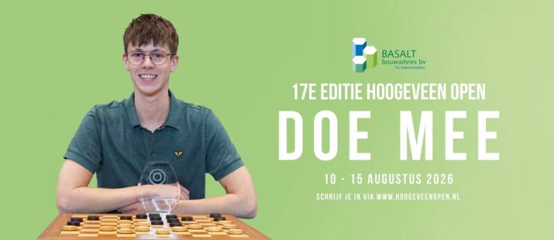 De inschrijving voor de 17e editie van het Hoogeveen Open 2026 is officieel geopend. Net als vorig jaar is Basalt Bouwadvies de hoofdsponsor van ons damtoernooi. Het toernooi vindt plaats van 10 t/m 15 augustus in sportcomplex Activum, gelegen in het Bentinckspark. Deelname staat open voor iedereen. Het inschrijfgeld bedraagt dit jaar 60 euro.